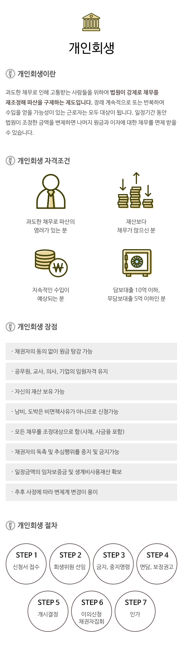 과도한 채무로 인해 고통받는 사람들을 위하여 법원이 강제로 채무를 재조정해 파산을 구제하는 제도입니다. 장래 계속적으로 또는 반복하여 수입을 얻을 가능성이 있는 근로자는 모두 대상이 됩니다. 일정기간 동안 법원이 조정한 금액을 변제하면 나머지 원금과 이자에 대한 채무를 면제 받을 수 있습니다.